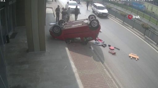 Bursa’da yola aniden çıkan otomobile çarpıp savrulan araç ters döndü. Ters dönen araçtaki kadın sürücü, kazayı unutup otomobil içinde yaralanan küçük kızının yardımına koştu.