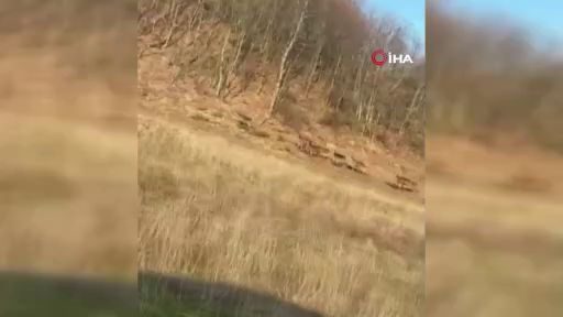 Kısa süre yol kenarında ilerleyen geyik sürüsü, daha sonra hızla yön değiştirerek yol kenarındaki ormanlık alana girdi. Ağaçlık alan içerisinde gözden kaybolan geyikler, izlerini kısa sürede kaybettirdi.
