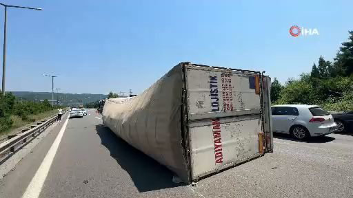 TEM Otoyolu Düzce geçişinde sürücüsünün kontrolünden çıkan tır yan yattı.