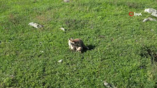 Tilkinin yavrularını emzirme anı dron ile kayıt altına alındı.